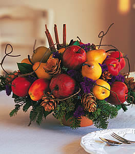Apples, pears and cinnamon sticks, along with fresh evergreens and pinecones, arrive in a terra-cotta pot.